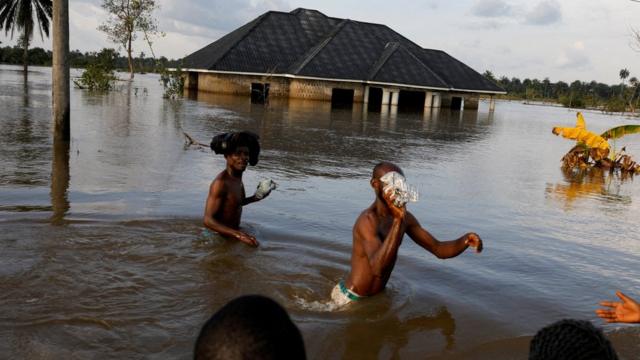 나이지리아 주민들이 홍수로 불어난 물을 피해 이동하고 있다